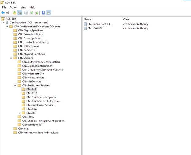 Certificates retrieved via LDAP are retrieved from Domain Controller. If we open Domain Controller and ADSIEdit.msc, then we can navigate to Services > Public Key Services > AIA and check the present certificates. Since our Issuing CA Certificate is absent, the PKI environment cannot retrieve the certificate from that location.