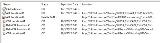 If the CDP/AIA locations are properly configured, these steps will temporarily help resolve the issues. For example, we will use AIA issues, which will also work for CDP issues.