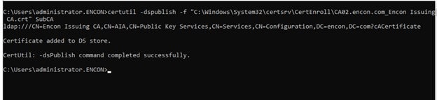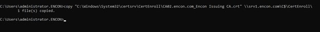 To resolve this, we copy the certificate from %windir%\System32\certsrv\CertEnroll location to our web server, which hosts our certificate.
