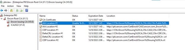 After we open and check PKIView.msc, we can see where the issue is. We can copy the URL to a notepad for further investigation.