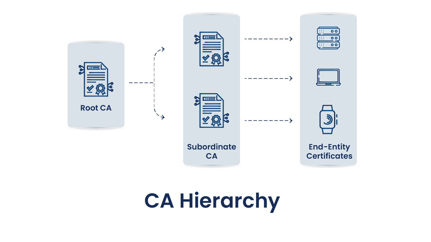 As you can see in the above diagram, there is a proper hierarchy of CAs, while each has its unique role and importance in PKI architecture. There are generally three types of hierarchies: one-tier, two-tier, and three-tier.