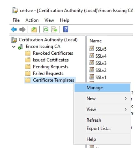 Open Certificate Authority and right-click on Certificate Templates, and choose Manage.