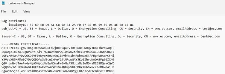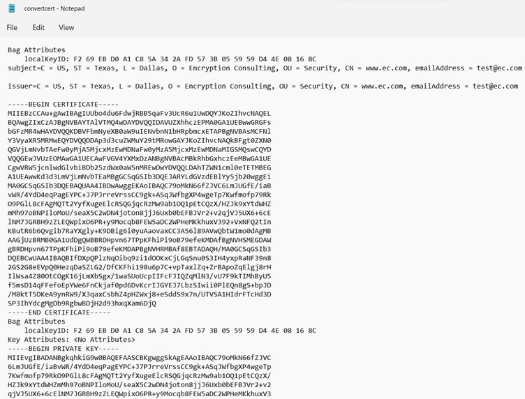 Execute the following command to convert the data in the certificatepfx.pfx file to PEM format in the convertcert.pem file. The PEM file contains all of the certificates that were in the PFX file, and each of the certificates is wrapped within headers.