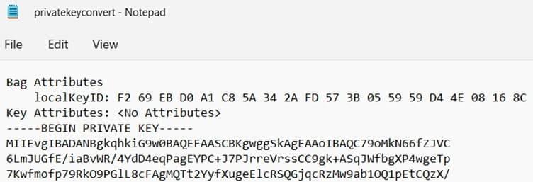 We use an OpenSSL toolkit to convert a PFX encoded certificate to PEM format. For testing this scenario, we use a password protected PFX-encoded file – certificatepfx.pfx and a 2048-bit RSA private key.