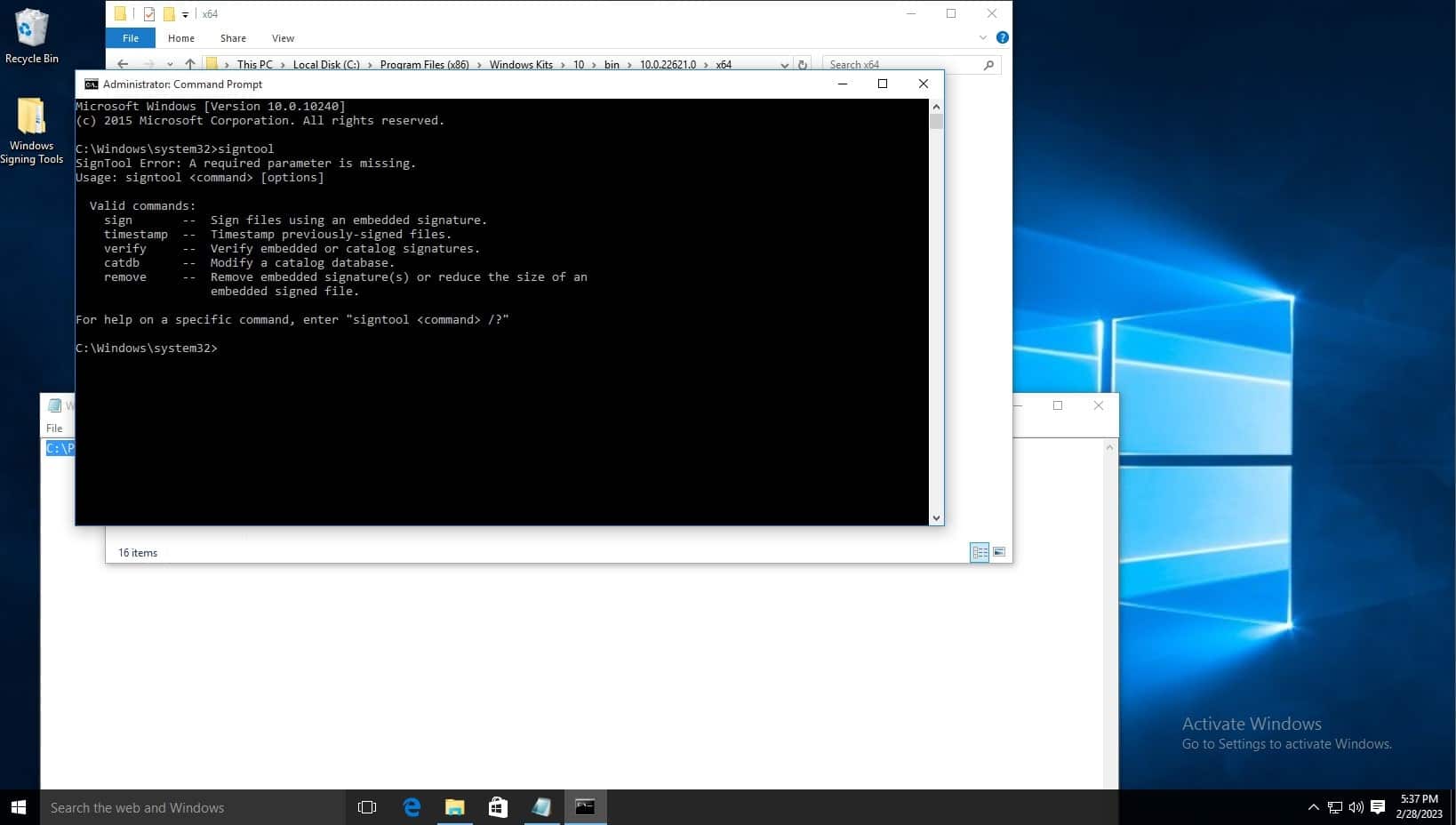 To test the installation, open command prompt, and type signtool, and the output should be as shown below.