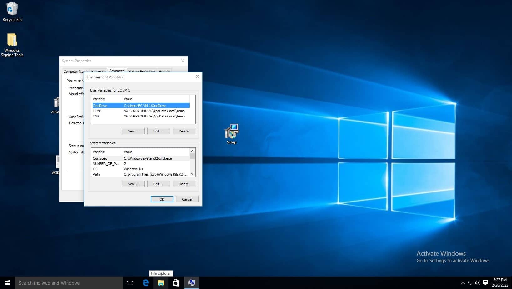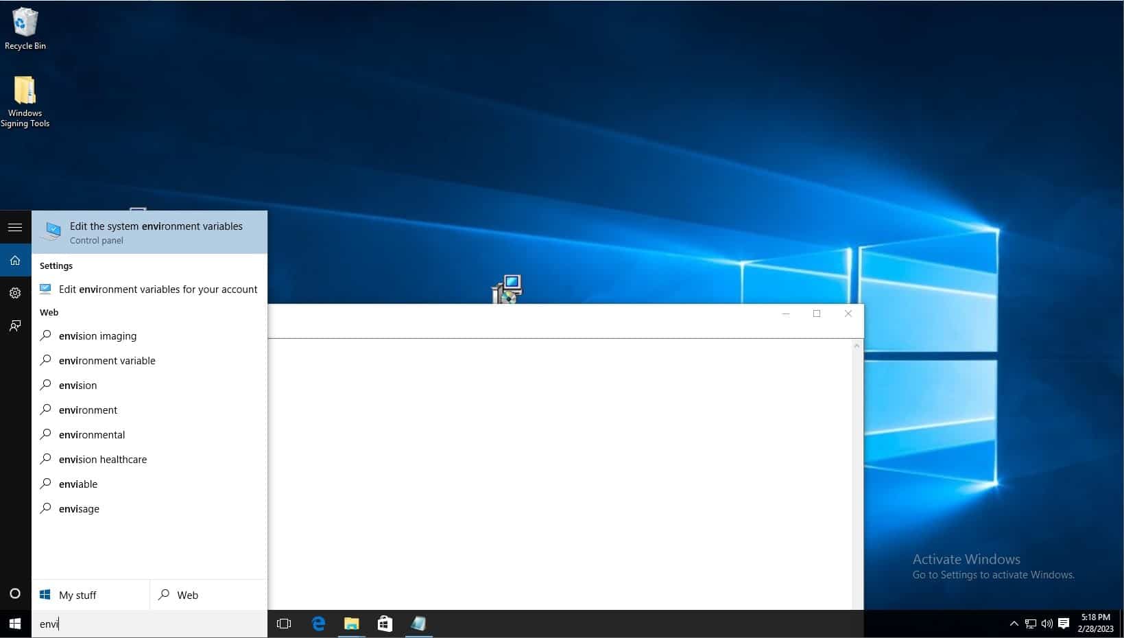 Click on windows search bar on task bar and type “Edit the system environment variables” and select the control panel option of the same name.