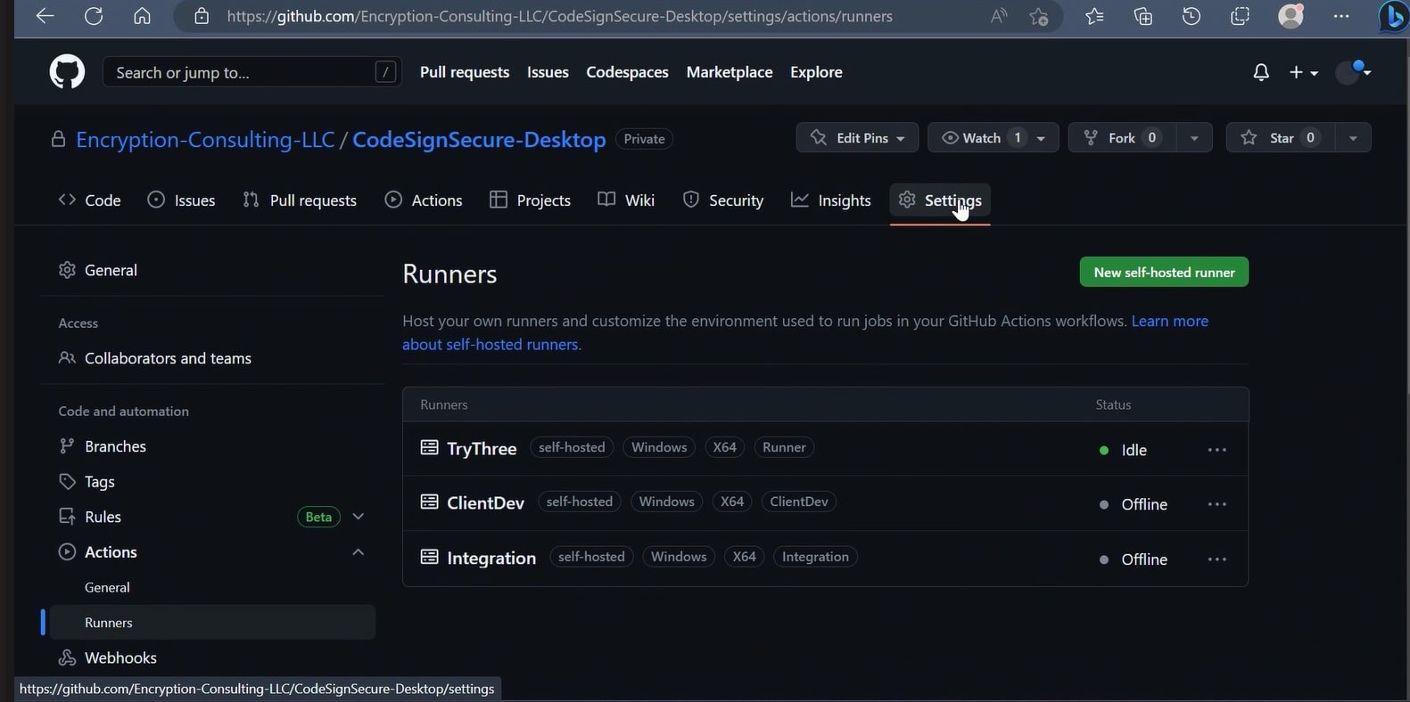 Before we get started, we will need to configure a runner. Runner will be setup in the device where you have Signtool and ECSigning KSP installed and configured. To do so in your device follow the steps below.