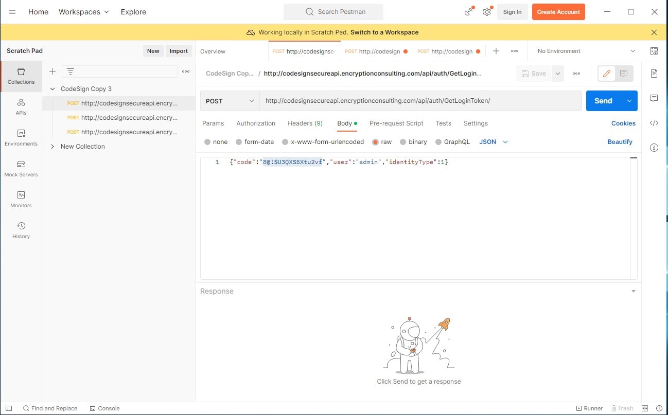 GetLoginToken API (http://codesignsecureapi.encryptionconsulting.com/api/auth/GetLoginToken): This is the most important API, as this gives you a Bearer Token to use with the rest of the APIs, What should be in the body is shown below. The code serves as a password in order to get a the Bearer Token, the user field is the username, and the identity type field specifices the user type. Click Send to generate an output which has the Bearer Token listed at the bottom. Copy this token for use.