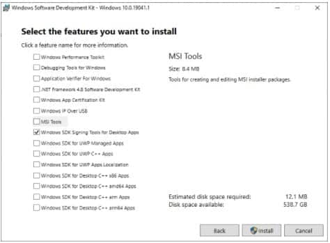 Deselect every feature except for Windows SDK Signing Tools for Desktop Apps, then select install.