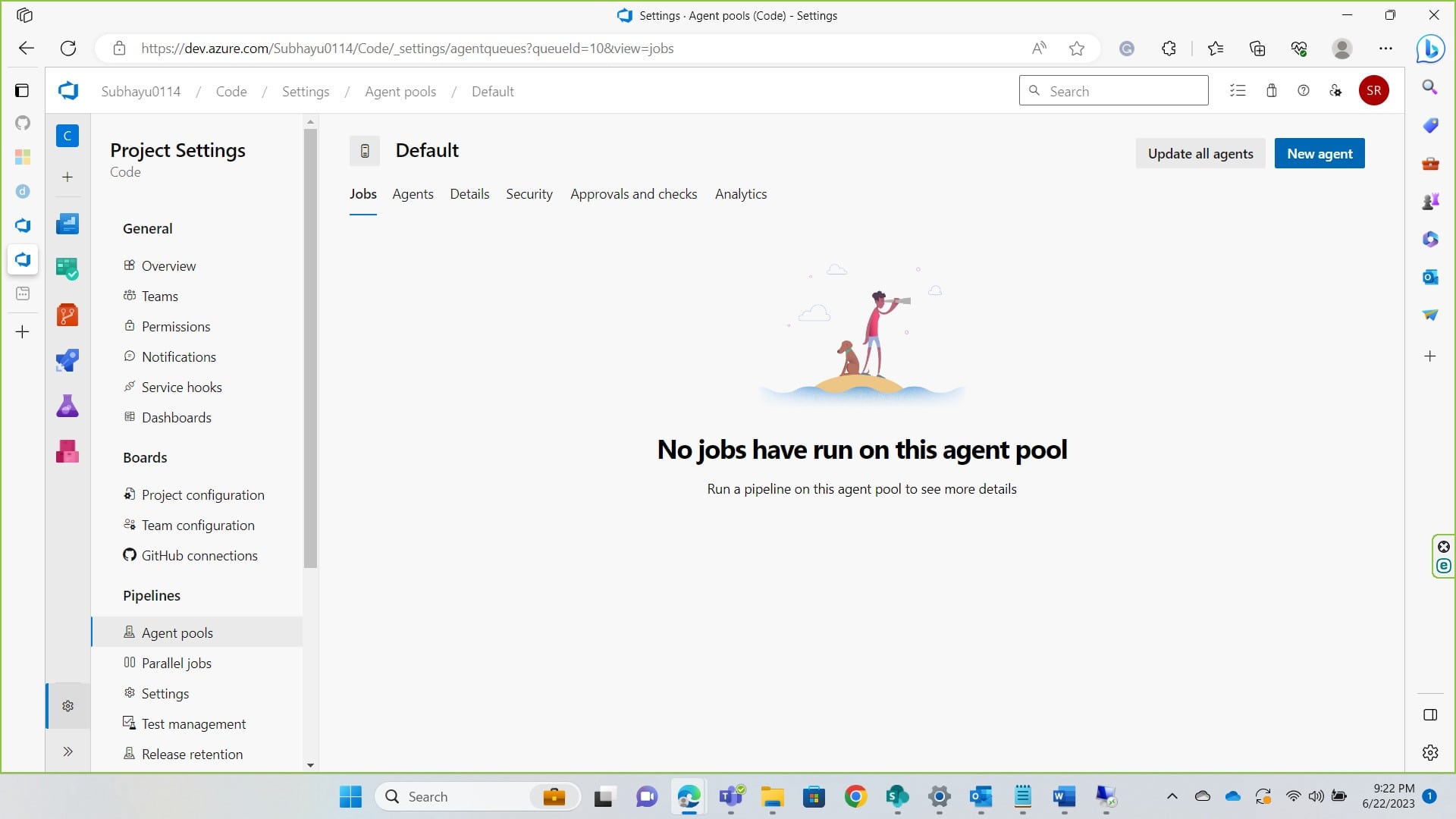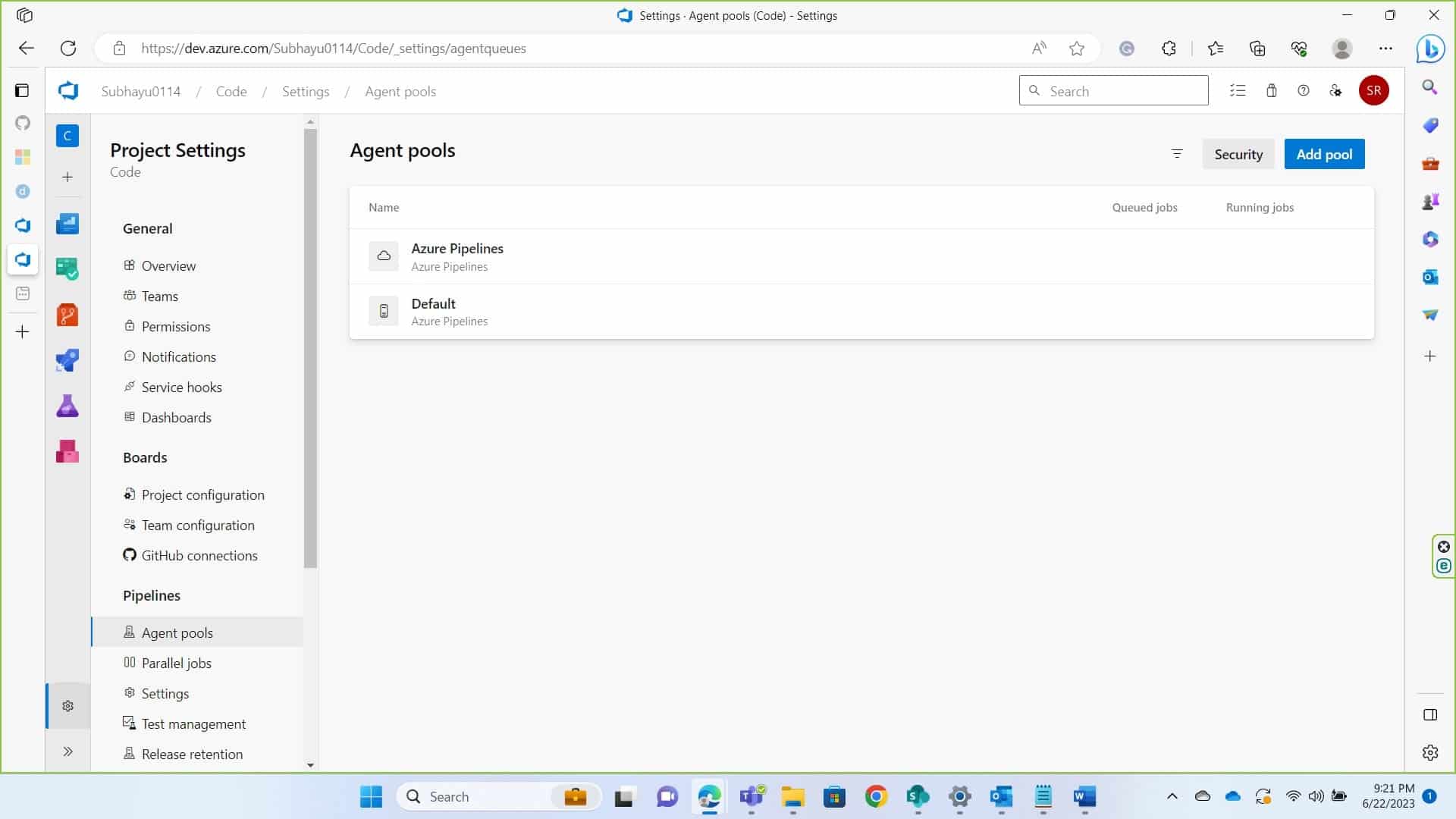 Under Pipelines, you’ll see Agent Pools. Click on that and then click on default.