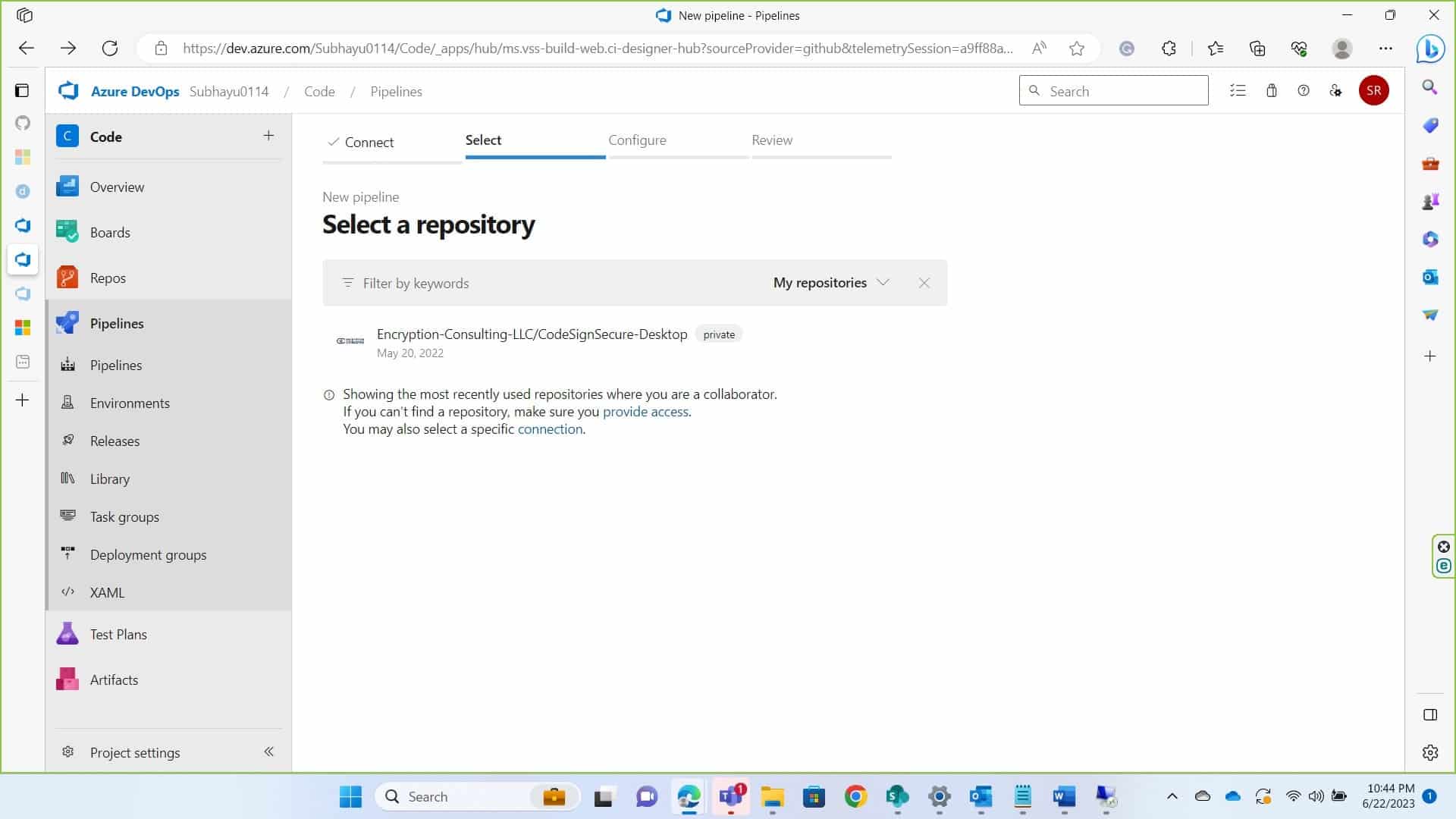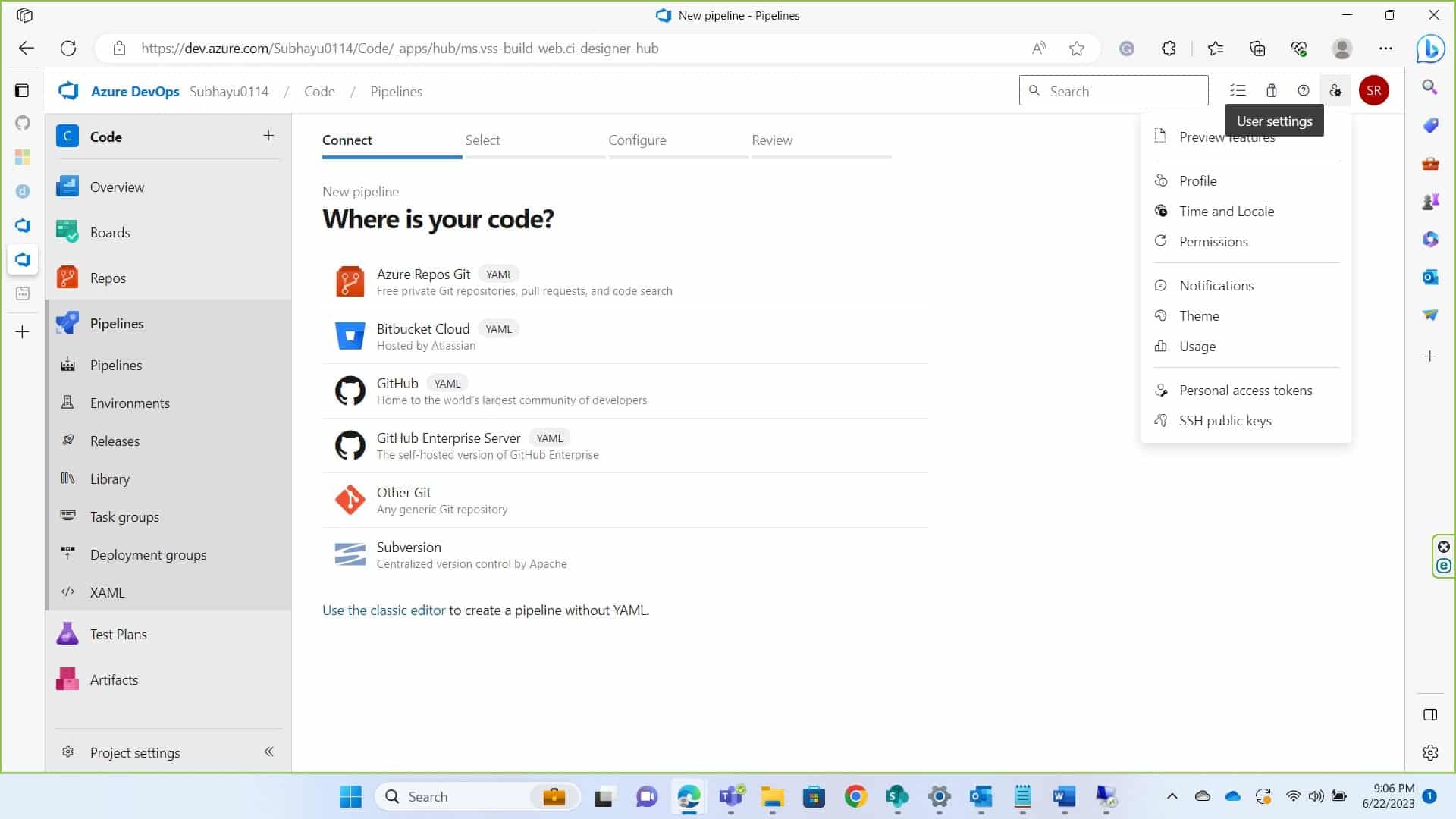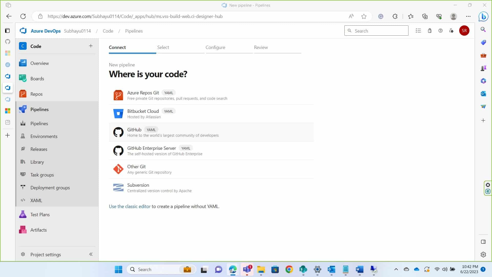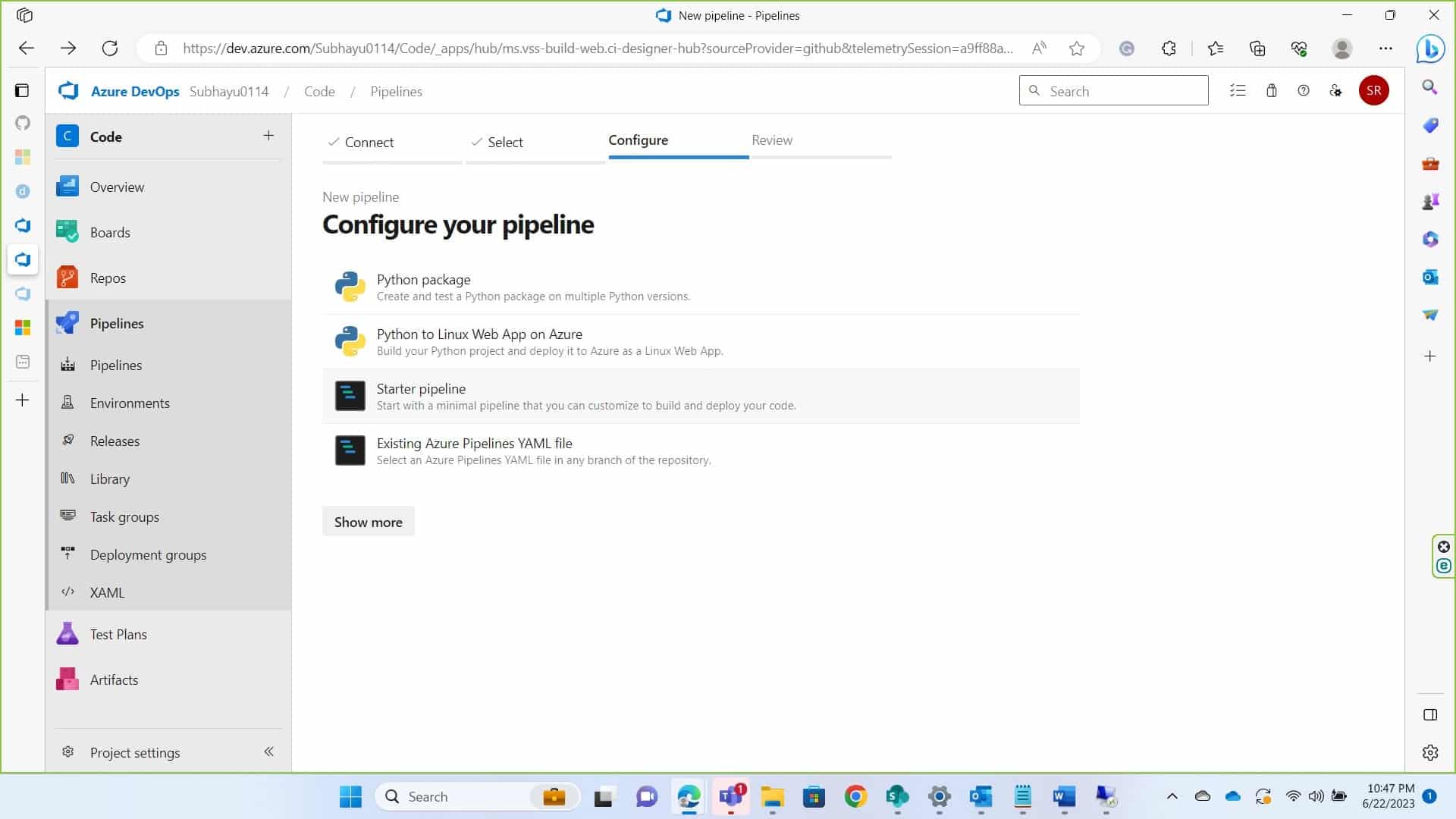 Now in the Configure Section, if you don’t already have .yml file in your repository click on Starter Pipeline, if you do click on Existing Azure Pipeline. For starter pipeline, you may need to create a new branch or commit on the main branch itself it’s your choice.