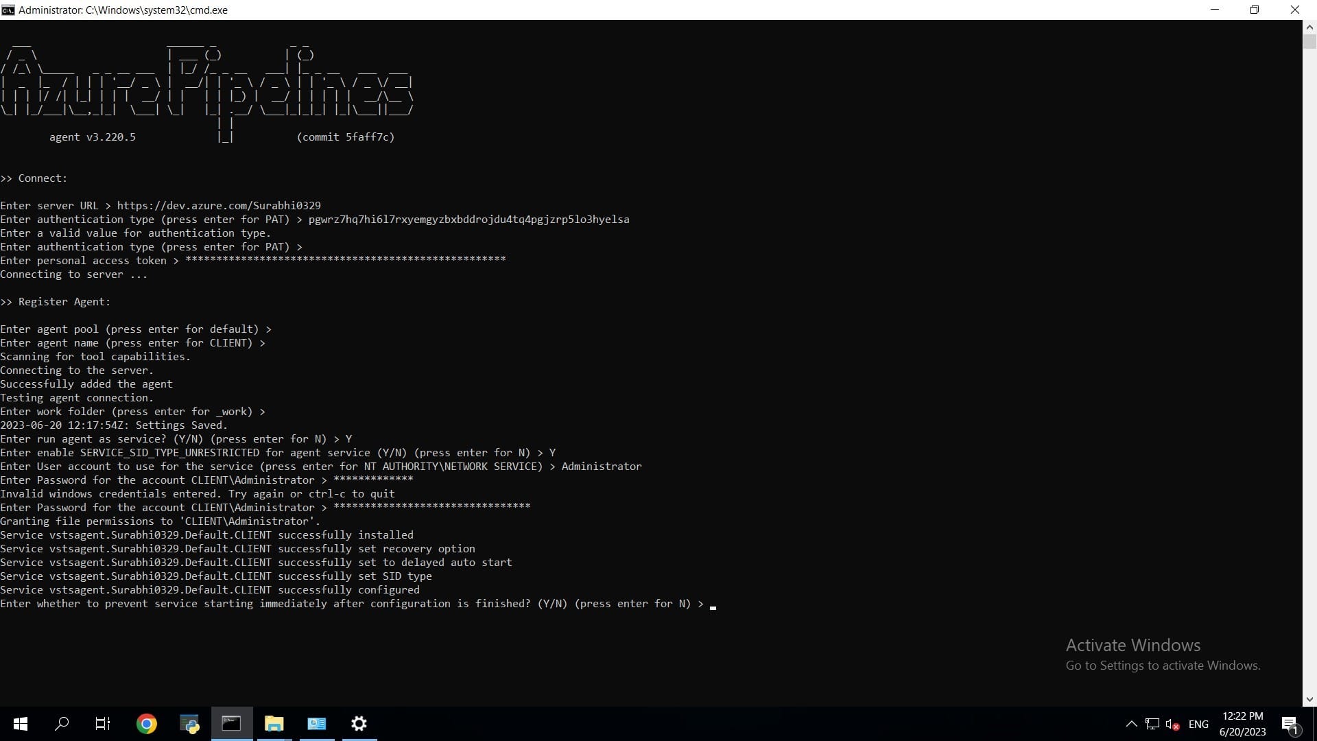Once the Agent is registered, For Agent Pool, since we’ve it as default, press enter If you want to name your agent something you can name them but press enter for it to be named as CLIENT.