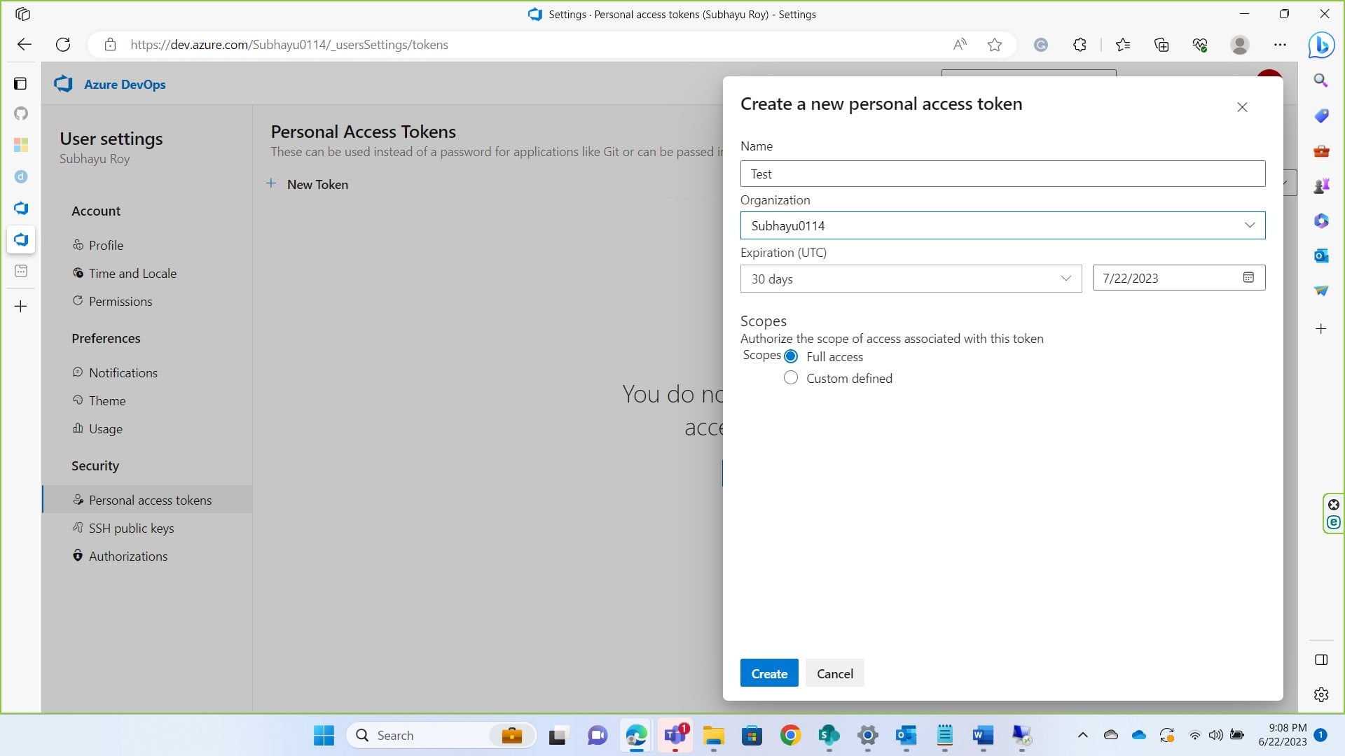 After a project is made, navigate to user setting at the top left corner of your screen and click on personal Access token. On the next page click on “New Token”. On the dialogue box prompted, provide necessary details such as name of the token, organization name (the organization you created/accessed earlier. Set Expiration and Scopes. I have set the Scope to full access.