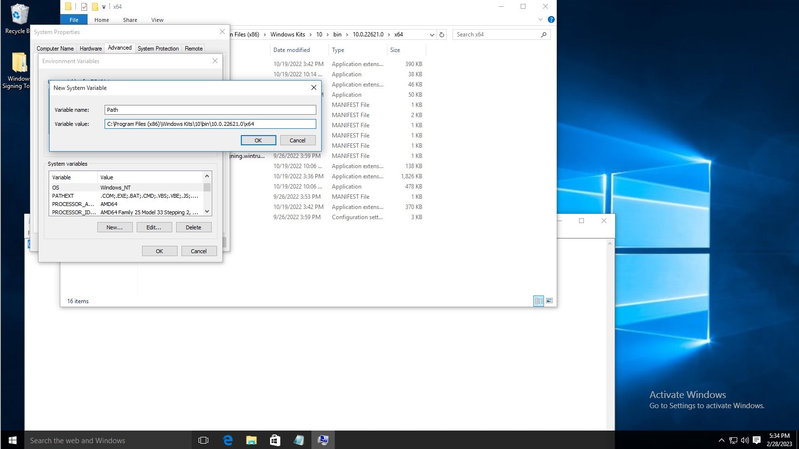 Before editing the variable list, navigate to where the Windows SDK is installed to using file explorer, you must copy the path of the folder which contains the signtool application, the default path is C:\Program Files (x86)\Windows Kits\10\bin\10.0.22621.0\x64, refer to the below screenshot. Make sure to right click and copy the path as shown. You can also see the signtool application at the bottom of the file list, this is the command you will run.