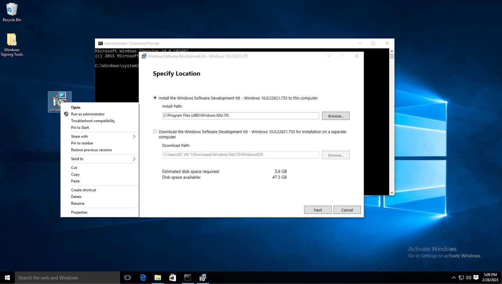 Open the winsdksetup.exe file. Remember the default path shown in the install path, as this will be helpful with running these commands from the command prompt.