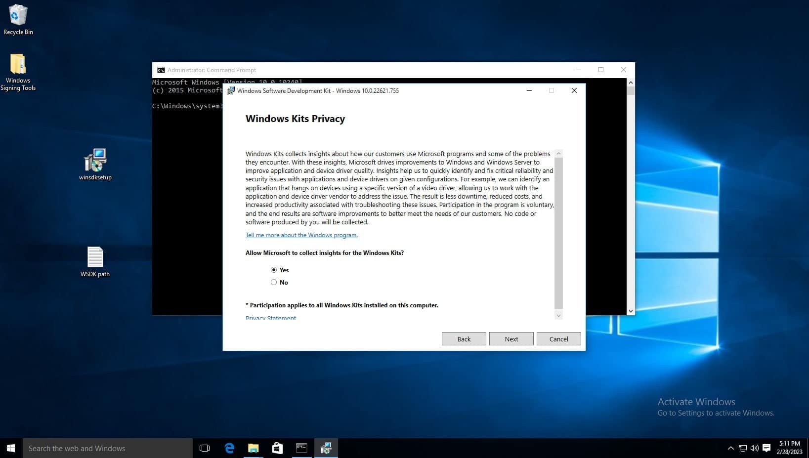On the Windows Kits Privacy page, either option for allowing Microsoft to collect insights is okay. Click next.