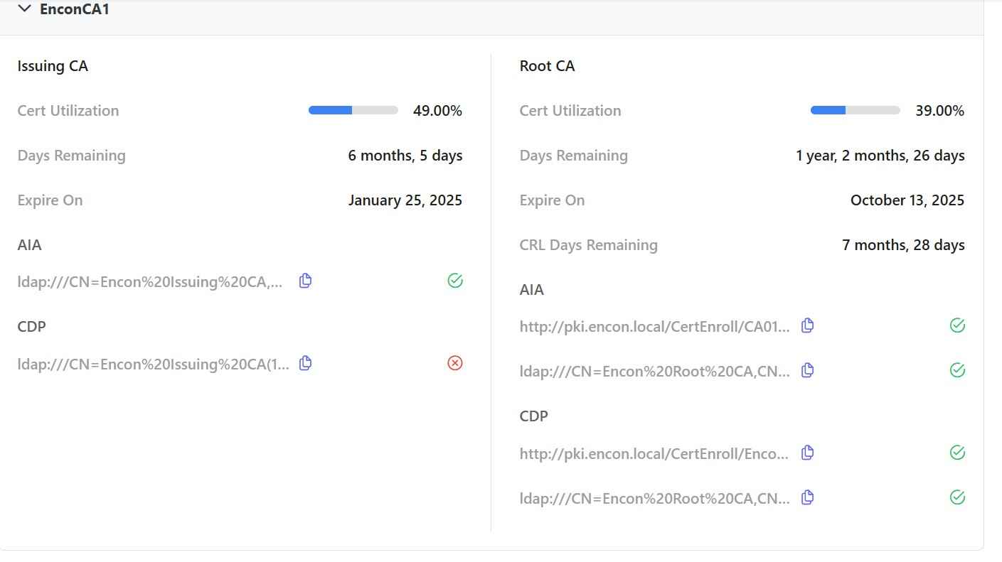 This can also help the operations team monitor their PKI directly from the dashboard. This will help ensure that all CDP/AIA points related to the CA are always active while also providing major updates on CRL and CA certificate renewal.