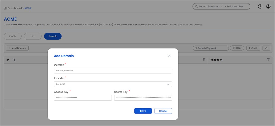 - Onboard the required ACME URL. For Let’s Encrypt, type in https://acme-v02.api.letsencrypt.org/directory