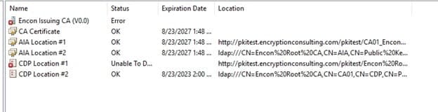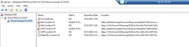 Once the files are uploaded, navigate to CA02 and open PKIView.msc again. Now CDP points of Root and Issuing CA should be available, but the AIA point would still show an error as we didn’t copy those files to the pkitest folder