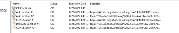 certutil -setreg CA\CACertPublicationURLs “1:C:\Windows\system32\CertSrv\CertEnroll\%1_%3%4.crt\n2:http://pkitest.encryptionconsulting.com/pkitest/%1_%3%4.crt\n2:ldap:///CN=%7,CN=AIA,CN=Public Key Services,CN=Services,%6%11”