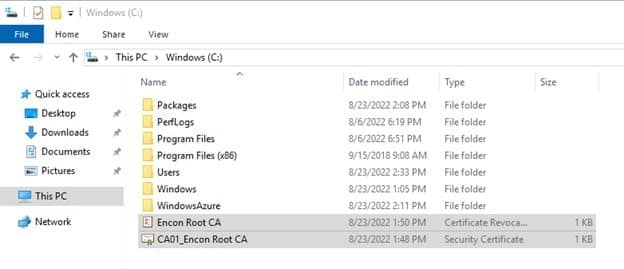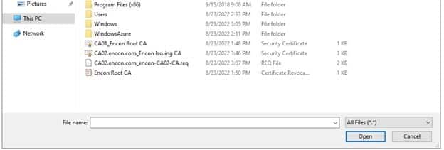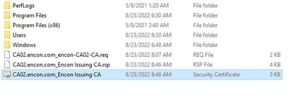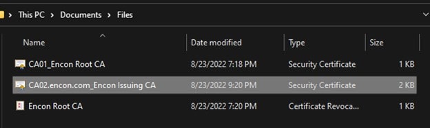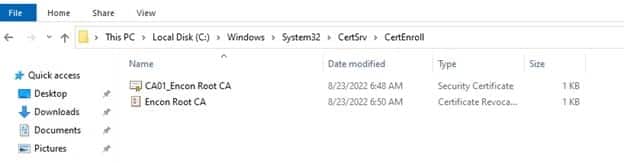 To upload the files, copy them from their respective machines and keep them handy on your host machine. You can find these files at C:\Windows\System32\certsrv\CertEnroll on both Root CA and issuing CA.