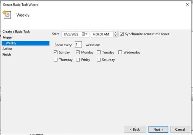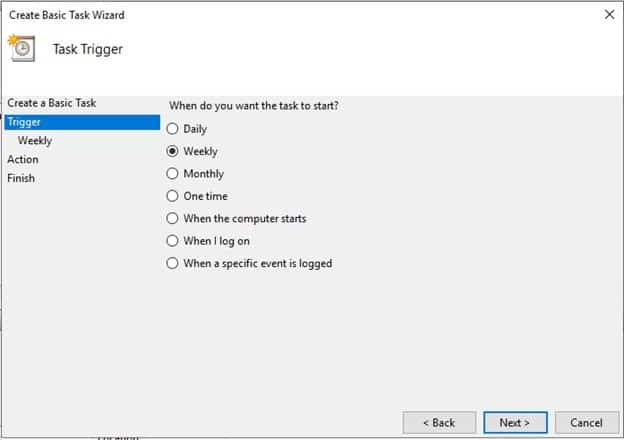 Task Trigger is configured to weekly