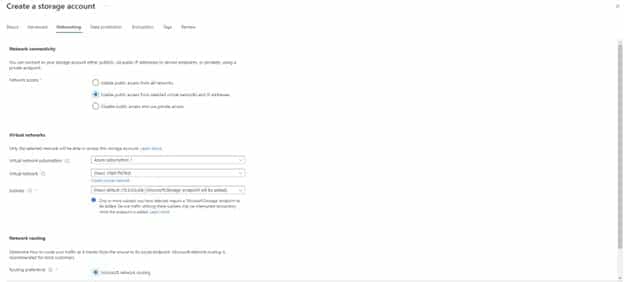 On the Networking tab, it is recommended to have public access from selected virtual networks and IP addresses and select the Virtual network where all the virtual machines will be deployed. If no virtual network exists, do create one.