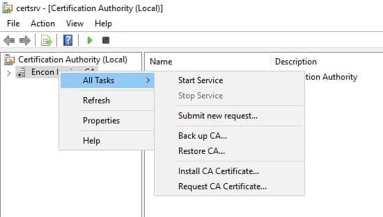 Right-click on Encon Issuing CA, click on All Tasks, and click Start Service