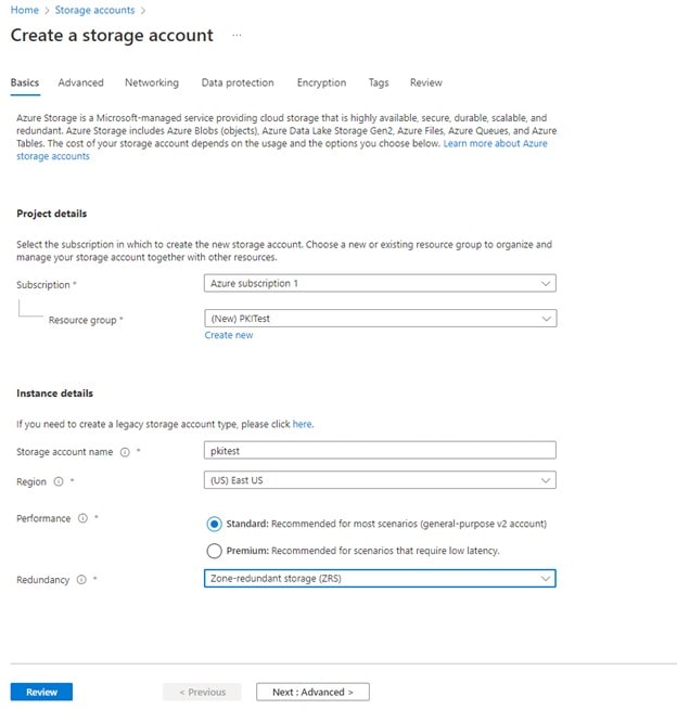 Provide the necessary details on the basics. For Redundancy, I would recommend at least Zone-redundant Storage (ZRS)