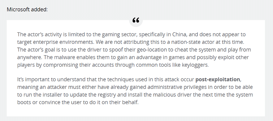 Microsoft said they are investigating a malicious actor who distributed these negative drivers (Netfilter) within gaming environments. This actor submitted drivers for certification through the Windows Hardware Compatibility Program. These drivers were built by a third party, so Microsoft has suspended their account and reviewed their submissions for additional signs of malware. The company (Microsoft) could not find evidence of either the Windows Hardware Compatibility Program signing certificate or its WHCP signing infrastructure being compromised. So, they have since added Netfilter detections to the Windows Defender AV engine built into Windows and provided this detection to other AV providers.