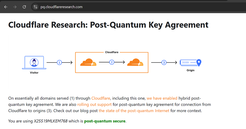 If PQC is successfully enabled and supported by your browser, the test page from Cloudflare may display a message such as “You are using X25519MLKEM768 which is post-quantum secure.” This indicates that the TLS connection between your browser and the server is using a hybrid post-quantum key exchange mechanism.