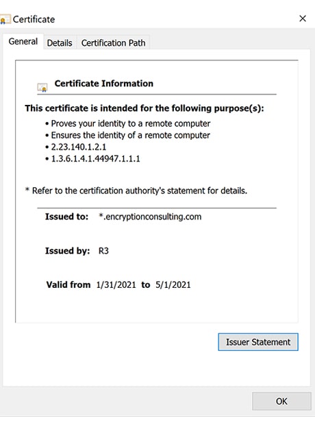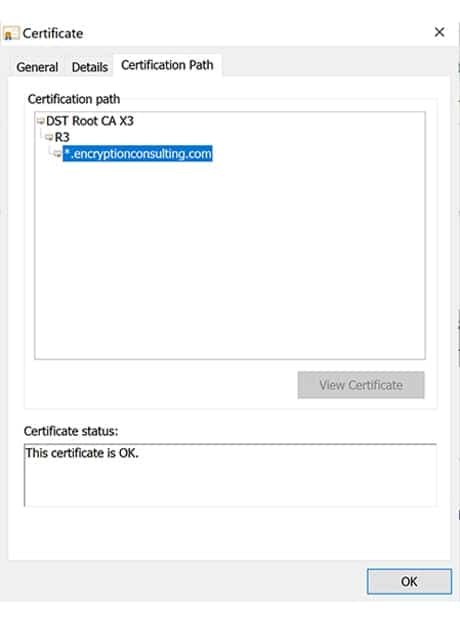 The image below is an example of what a Chain of Trust looks like. The certificate at the bottom, named *.encryptionconsulting.com is this website’s certificate. The certificate named R3 is the Intermediate certificate, and the certificate named DST Root CA X3 is the Root certificate. Several components are checked on each of these certificates: