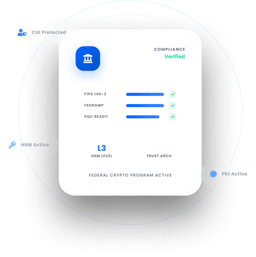 Fully managed, single tenant PKI on FIPS 140-3 Level 3 HSMs issuing trusted identities for agency users, systems, and devices across SCEP, EST, and ACME protocols.