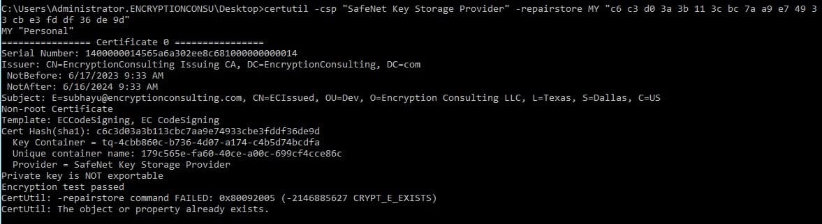 If the private key is not attached to the Certificate, try this “repairstore” command