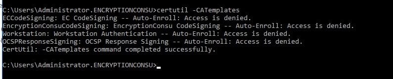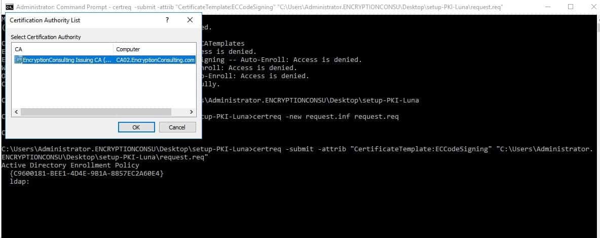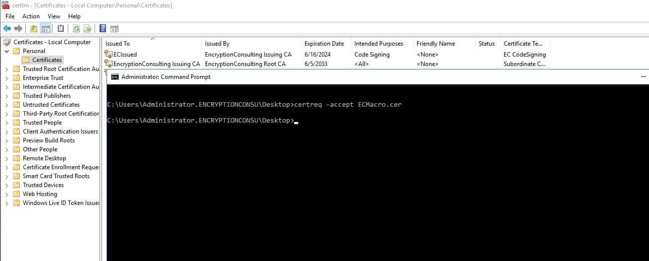certreq -submit -attrib "CertificateTemplate:<Template Name>" "C:\MacroSign.csr"Here, Template Name = “EncryptionConsuCodeSigning”