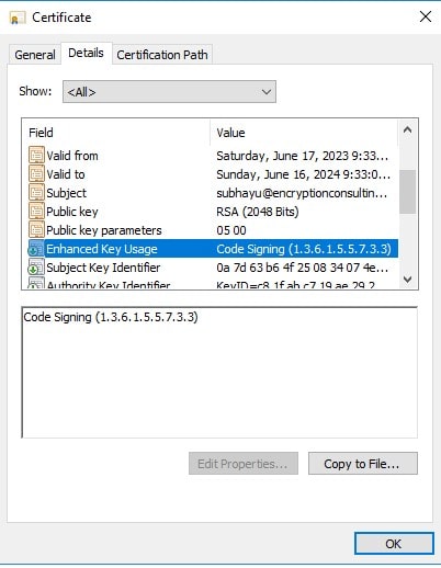 Check whether “Code Signing” is inside the attribute Enhanced Key Usage of the newly generated certificate.