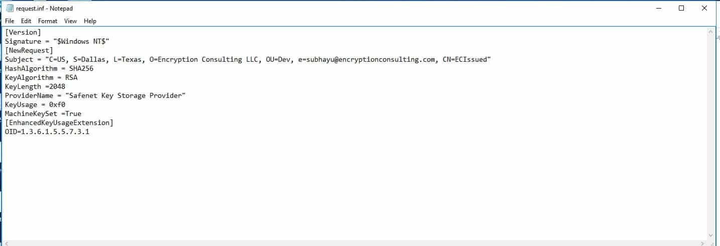 Subject = "C=US, S=Dallas, L=Texas, O=Encryption Consulting LLC, OU=Dev, e=subhayu@encryptionconsulting.com, CN=ECIssued"