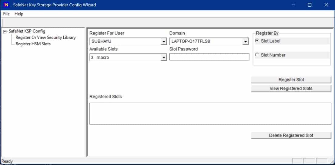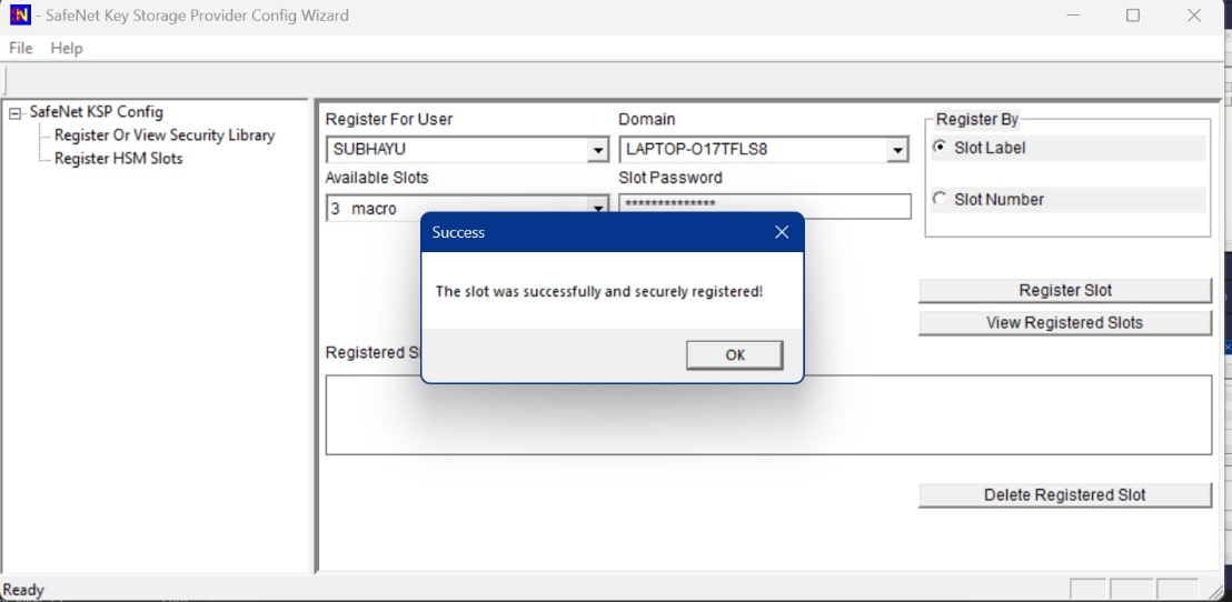 Register the HSM for the Administrator user. For that, Open the Register For User drop-down menu and select Administrator; open the Domain drop-down menu and select your domain. Open the Available Slots drop-down menu, select the service label, Enter the Slot Password, and Click Register Slot.