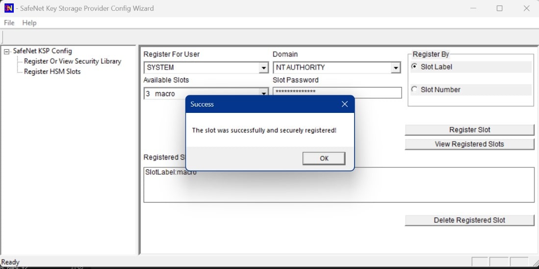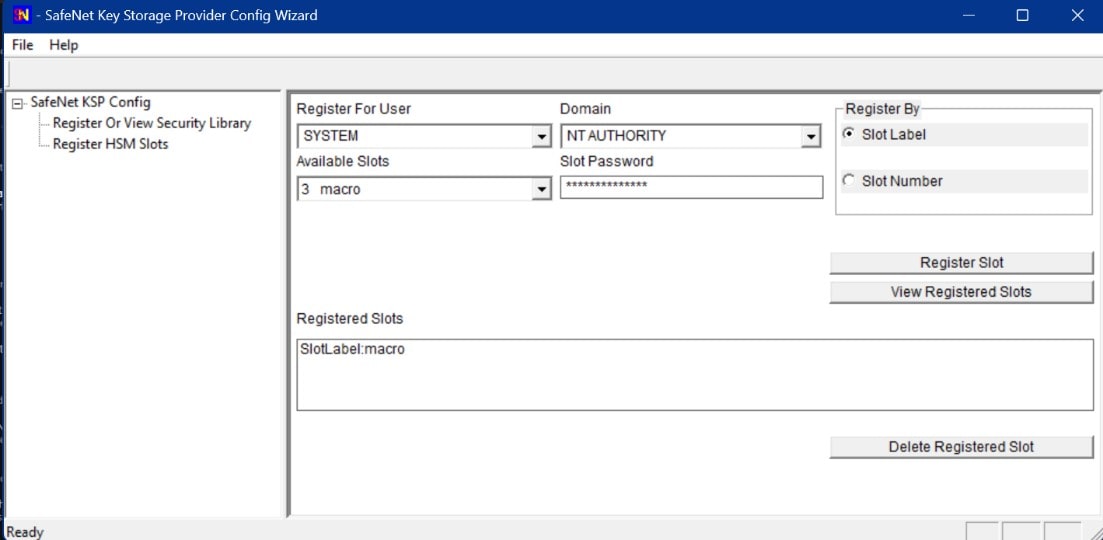 Register the HSM for the System user. Open the Register For User drop-down menu and select SYSTEM, the Domain drop-down menu, and NT AUTHORITY. Open the Available Slots drop-down menu, select the service label, Enter the Slot Password, and Click Register Slot.