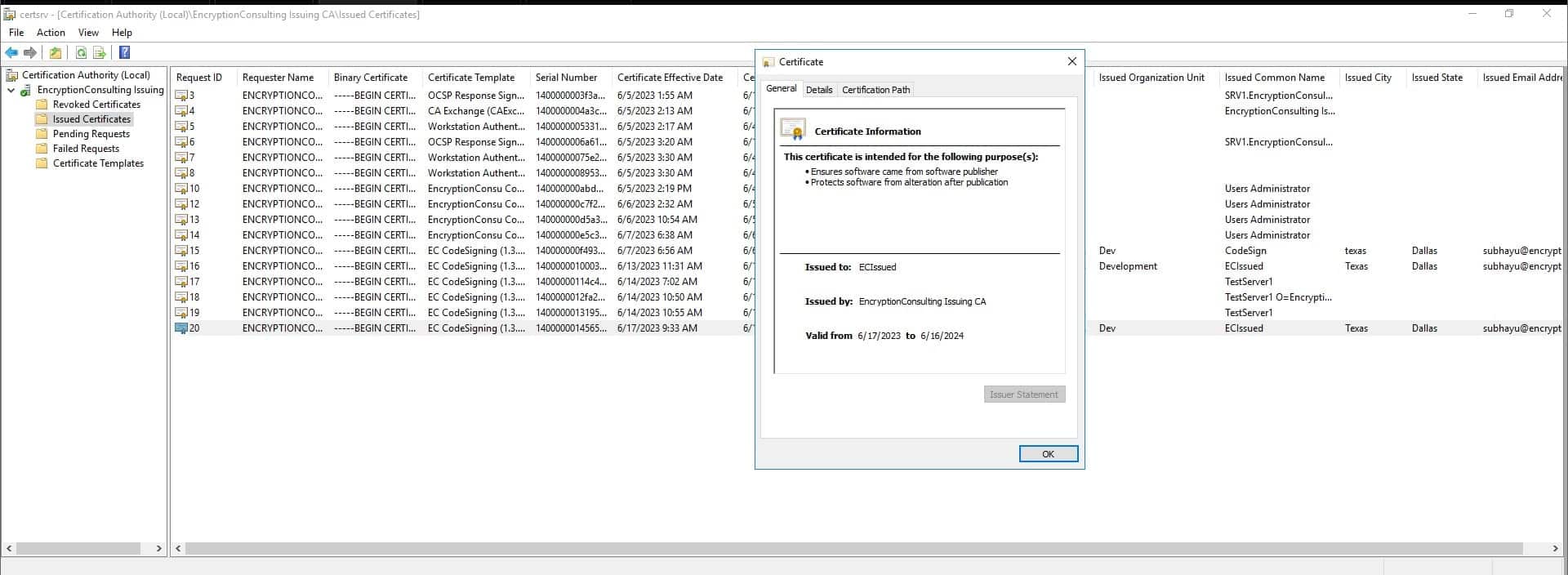 On successful execution, you will find the Certificate inside the Issued Certificates in Certification Authority
