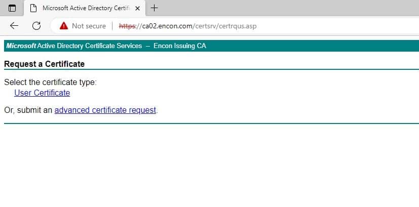 After selecting Request a Certificate, this screen will come up. Select Advanced Certificate Request. (In our case – https://ca02.encon.com/certsrv/certrqus.asp)