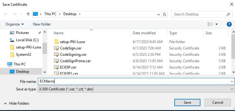 After Selecting the Certificate Authority from the Certificate Authority List, save the certificate with an appropriate name. (E.g.,= ECMacro, the extension should be either .crt or .cer)