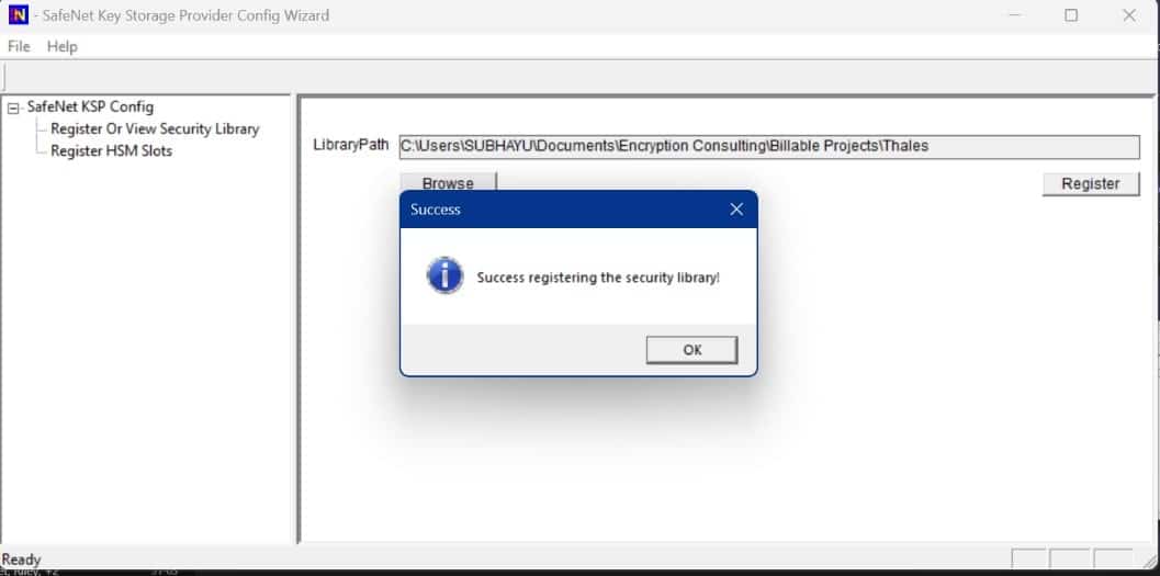System requires access to the SafeNet Key Storage Provider (KSP). Copy the SafeNetKSP.dll file from your downloaded Luna Cloud HSM Service Client to C:\\Windows\System32.