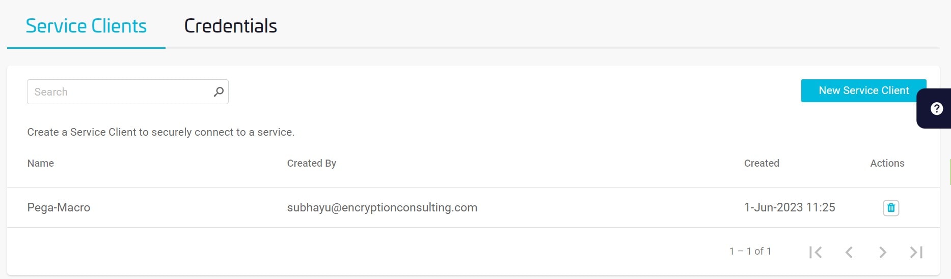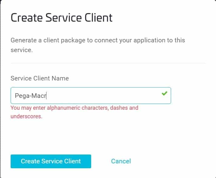 In the Create Service Client window, enter a Client Name (e.g., Pega-Macro) and select Create Service Client.