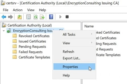 In the console tree, right-click CAName (where CAName is the logical name of the CA) and then click Properties.