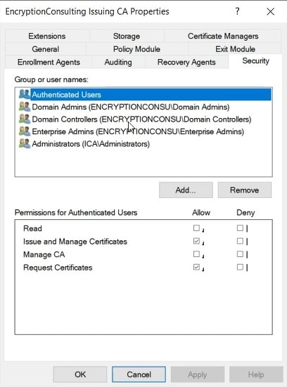 In the CAName Properties dialog box, select the Security tab to ensure that the user account or a group that the user is a member of is assigned the Issue and Manage Certificates permission.