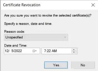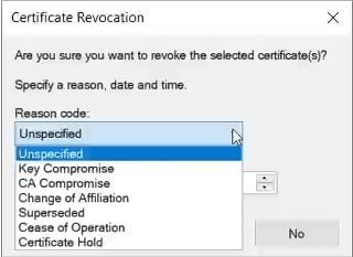 Select the appropriate reason code in the Reason Code drop-down list in the Certificate Revocation dialog box, and then click Yes.