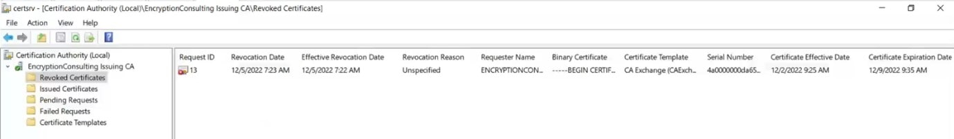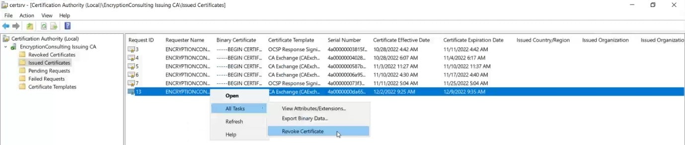 In the details pane, find the certificate you need to revoke, right-click the certificate, point to All Tasks, and click Revoke Certificate.